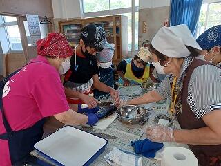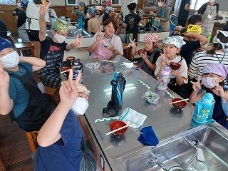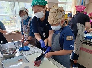 今日は、5年2組の総合的な学習の時間に、食育ティーチャーの松浦先生を始め、日南漁協婦人部の方々、地域学習ボランティアの方々が来校され、カツオ飯づくりを行いました。まず始めに、宮崎県南那珂農林振興局の魚博士である三木さんからカツオのことについて、いろいろ教えてもらいました。次に、漁協婦人部の方に、カツオを三枚におろす方法を実演していただきました。その見事な包丁さばきに子ども達から拍手もわき上がりました。そして、実際にグループごとに、カツオ飯づくりを開始しました。初めて魚を裁く子ども達は、恐る恐る包丁を握っていましたが、ボランティアの方々のご指導のおかげで、怪我なく安全に、そして、美味しいカツオ飯が出来上がりました。試食の時間は、和気藹々とした雰囲気でボランティアの方々と談笑している姿が印象的でした。明日は、5年1組が行います。ご協力いただいたボランティアの方々、ありがとうございました。明日もよろしくお願いします。