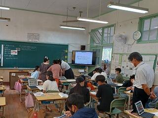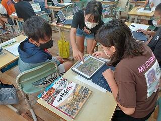 今日は、6年生の社会科の研究授業がありました。単元「戦国の世の統一」の導入部分の授業でした。長篠の戦いを描いた「長篠合戦図屏風」をもとに、当時の戦いの様子から、グループで話し合いながら、学習問題を立てていきました。タブレットだと、簡単に拡大して見ることができて、詳しく読み取ることができました。デジタル教材の良さを十二分に活用された授業でした。子ども達も楽しそうにいろんな考えを出し合い、学びを深めていました。