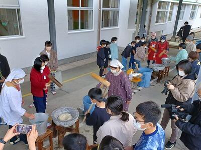 今日は、5年生が餅つきをしました。4月に植えたもち米を、昔ながらの杵と臼を使ってつきあげました。JAはまゆうの女性部や青年部の方々や学習支援ボランティアの方々10名程にお手伝いいただきました。前日からお米を研いだり、道具を揃えたりしていただきました。今日は、一緒に杵を振ったり、お餅を丸めたりと楽しい活動を支援していただきました。自分たちでついたお餅をおいしく食べる子ども達と一緒にボランティアの方々の笑顔も印象的でした。とてもよい体験ができました。ありがとうございました。UMKの取材も来ていましたので、夕方のニュース、2月12日の「大地のちから」で放送されるそうです。是非ご覧下さい。