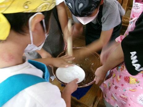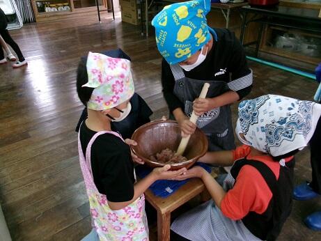 次に、昔の道具であるすり鉢やすりこぎを使って、魚のすり身をこねました。