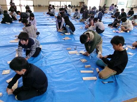 最後に紙やすりで角を削って、工程が終了しました。なめらかな飫肥杉の感触がとてもよい作品が仕上がりました。