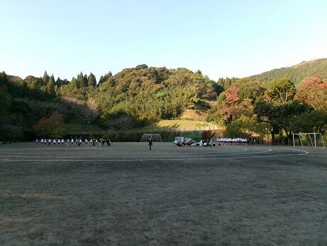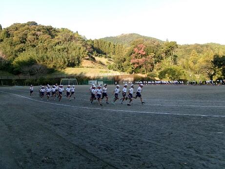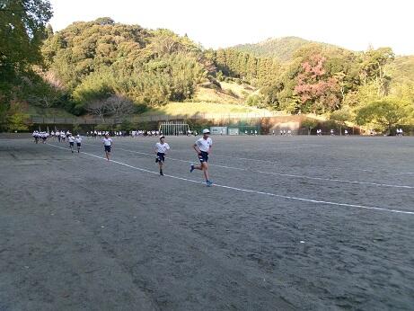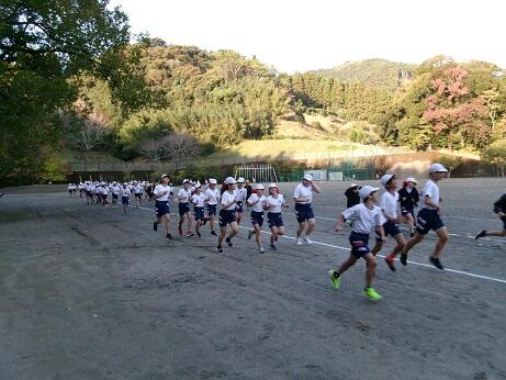 鼓ヶ岳の山懐に抱かれて、児童は3分間の持久走に取り組んでいます。新鮮な空気の中、自分のペースで走っています。