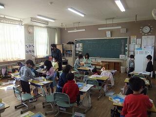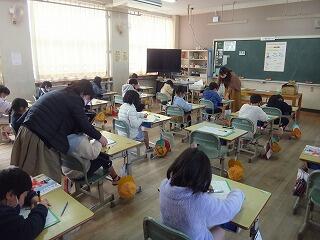 1年生が下校した後、6年生が1年生の教室に移動し、授業をしました。小さな机や椅子に座り、とても窮屈そうでした。6年間の成長を実感していたようです。6年間の成長は大きいですね。