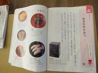 教科書のおせちの写真は、どれも色鮮やかでとてもおいしそうでした。お正月に食べるときには、なかなかその意味まで考えませんが、おせちの料理一つ一つには大事な意味が込められているんですね。今日、お子さんが帰って来られたら、おせちについて、ぜひ話し合ってみてください。