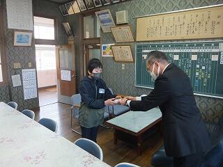 日南市では、例年1月に「新春子どもの声を聴く会」が行われています。今年はコロナ禍のため、映像審査となりました。その結果、本校代表として発表した6年児童が、小学生の部で最優秀賞に選ばれ、本日教育長都甲政文様においでいただき、校長室で表彰式をしていただきました。おめでとうございました。