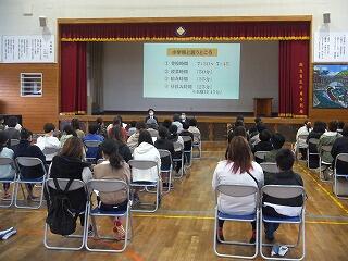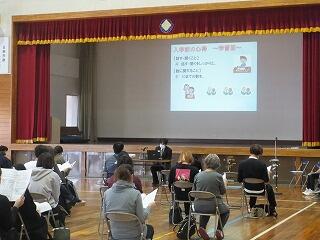 本日、新入学児童保護者説明会を実施しました。担当職員から、入学前にできるといいことや準備物、集団登校・下校等について、説明しました。児童クラブの方からも説明していただきました。