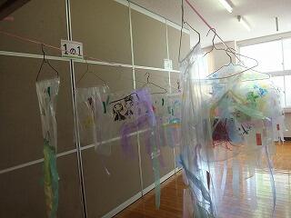 作品展示室の前を通ると、たこのようなものがたくさん揺れていました。これは、1年生がビニル袋などで作った図工の作品です。たくさん揺れていて、みごとでした。その他の学年も力作ぞろいです。参観日にお越しの際は、ぜひお立ち寄りいただき、ご覧ください。