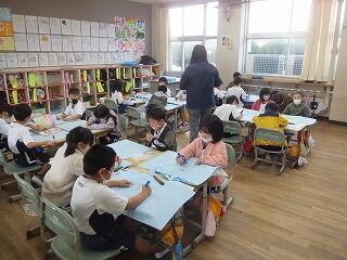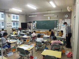 1年生が下校した後、6年生が1年生の教室に移動し、授業をしました。小さな机や椅子に座り、とても窮屈そうでした。6年間の成長を実感していたようです。6年間の成長は大きいですね。