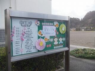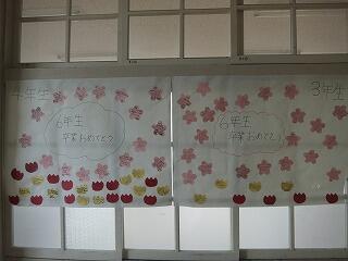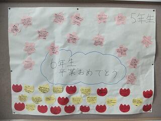 今日から3月。校門の掲示板も春らしくなりました。また、6年教室近くの階段や廊下には、下級生からの「卒業おめでとうメッセージ」も掲示してありました。感謝や応援の言葉がたくさん書かれています。卒業式まで、学校に来るのは今日を含めてあと18日。6年生のみなさん、残り少ない小学校生活を悔いのないよう過ごしてください。