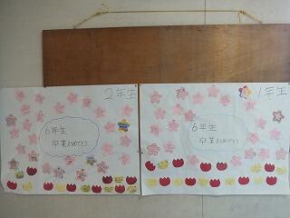明日はいよいよ卒業式です。4校時に2~4年生が体育館にシートを敷いたり、椅子を出したり、階段や廊下などを掃除したりしました。5校時には、仕上げとして5年生が体育館に花を並べたり、6年生教室の装飾をしたりしました。お世話になった6年生のために、みんな一生懸命がんばってくれました。みんなのおかげで、明日はすばらしい卒業式になることと思います。