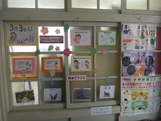 今日3月3日は、ひなまつり。「耳の日」でもあります。保健室前の廊下には、耳に関するいい情報、それこそ耳寄りな情報が掲示してありました。また、動物の耳あてクイズもあります。児童のみなさんは、ぜひ挑戦してみてください。ご家庭でも、子どもたちの耳をぜひご覧ください。