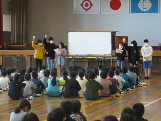 図書委員会からは、各学年の多読賞の表彰、「旅する読書」達成者の紹介がありました。今年度は、100冊達成者が8名、50冊達成者が2名いました。春休みもたくさん本を読んでもらいたいと思います。