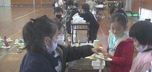 4年生が、昨日1・2時間目の「総合的な学習の時間」にさとねり蒸しパンを作りました。先日、さとねり工場見学に行った時の油津小学校の「さとねり」が届いたので、蒸しパンの中に、さとうきびがらできた黒砂糖を入れて作りました。とてもきれいに、おいしくでき上がりました。