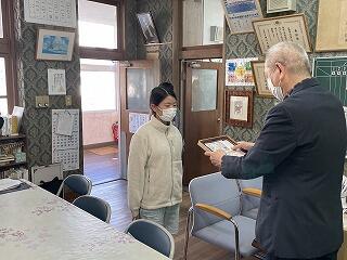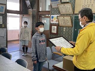 感謝状贈呈を受けたのは、5年生髙巣凛人さん。ポスターコンクール賞状を授与されたのは、5年生の土田睦乃さんです。おめでとうございました。今後も花の苗が届きますので、油津小をきれいな花で彩ってください。