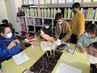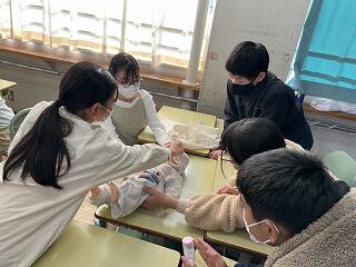 命の教育の一環で育児について考える授業をしました。子どもたちは、人形をだっこしたり、洋服を脱がしたり、おもつをかえるといった疑似体験をしました。「思ったより重くて大変だった。」「服を着替えさせるだけでも手間暇かかる。」等の感想をもつことができました。みんな大事に育てらてたことを実感したことでしょう。