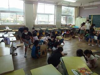 2年生が図工で、「くしゃくしゃ ぎゅっ」という題材に取り組んでいました。子どもたちは、紙をくしゃくしゃにして感じ方の違いを味わったり、紙を袋状にして中に新聞紙などを詰めたり、紙の形をさらに変えたりしながら、作りたいものを考えていました。どんなものができ上がるか楽しみです。