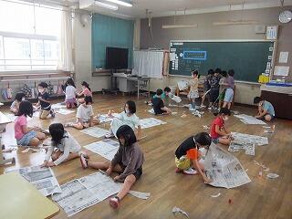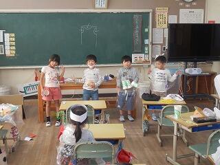 子どもたちは、教室いっぱいに新聞紙を広げ、丸めて剣や望遠鏡のようなものを作ったり、体に巻き付けてスカートやレインコートのようにしたりしている子もいました。思いっきり活動できたようです。