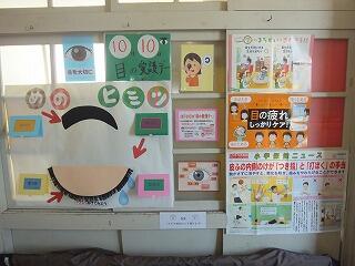 さて、明日10月10日は、「目の愛護デー」です。保健室前には、目に関する掲示物が貼ってあります。まゆげやまつげなどの「めのひみつ」や「目の疲れをとるためのケアのしかた」など、養護教諭が工夫して作成したものもありますので、月曜日学校に来たら、しっかり読んで、自分の目の健康のために役立ててください。