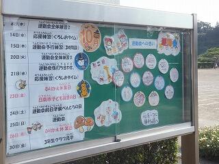 校門近くの掲示板を見ると、「運動会への思い」が掲示されていました。両団の団長、副団長の思いが文で、各学年の思いが絵や文で表現されていました。表現は違っても、それぞれがんばろうという思いが伝わってきます。
