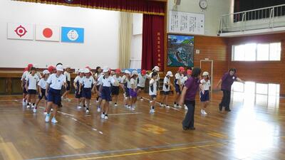 1年生は、体育で、元気に「おにごっこ」や「タイヤ跳び」をして、楽しく体力を伸ばしています。