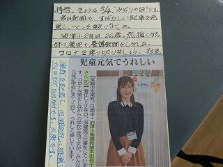 本校の養護教諭の記事が先日、5月2日宮日新聞の方に掲載されました。するとすぐに学校の方へ応援メッセ-ジが寄せられました。とても暖かい文章が書かれており、うれしく感じました。このように気を使ってくださり、本校職員も元気になりました。ありがとうございました。