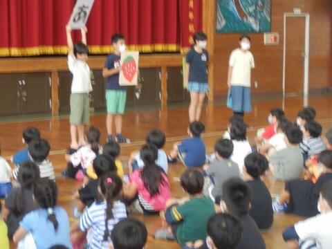 昨日、久しぶりに黒潮タイムがありました。今回は、計画委員会の劇で、「あいさつの大切さ」でした。とても楽しく分かりやすく劇にしてくれてあいさつの大切さが良く分かりました。6年生の発表の声も堂々としていて素晴らしかったです。また明日からあいさつを頑張ろうという気になりました。その後、虹の歌や踊りもありました。