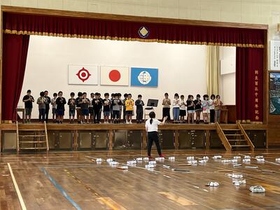 迫力のある太鼓の演奏、そして、岩切座長に「夢をもとう!」と語っていただきました。