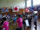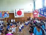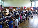 体育館の2階には、午前中のうちにPTAの方により大漁旗が飾られました。