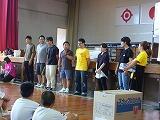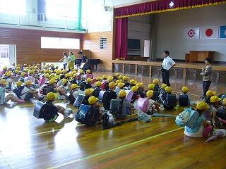 まず、子どもたちは全校一斉放送を聞いて帰る用意をし、その後の放送で体育館に移動しました。