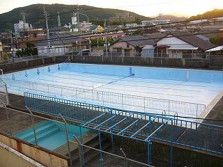 水を抜いただけのプールには、泥のようなものがたまっています。