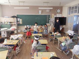青年部の方から嵐の手洗いダンスを教えてもらいダンスをした後、プレゼントをもらいました。飫肥杉の積み木とスケッチブック、マスク、メッセ-ジカ-ドが入っていました。とても大喜びでした。ありがとうございました。