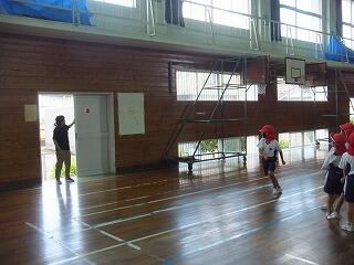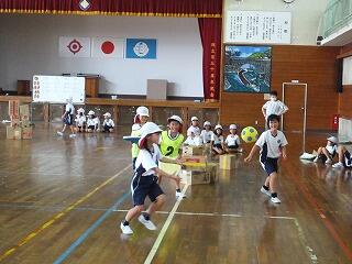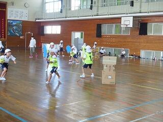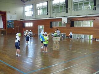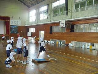 今日は、2年生が工夫をして、楽しくできる「投げる運動」をしていました。ひとつは、自然に投げ方が上手になる練習。上のギャラリーにつなげたトラロープにバトンをとおし、2人で協力して、そのバトンを遠く上まで投げる練習です。(どういうものかは写真をご覧ください。)もうひとつは、的あてです。点数が書いてあって、よ~くねらって投げます。このように場を工夫していくと、子どもたちの体力も楽しみながら向上していくと思います。