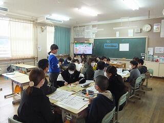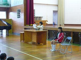 リコーダーの二重奏の音色がきれいでした。また、油津地区の自然や施設について調べたことをクイズ形式で発表しました。大変詳しく調べていました。