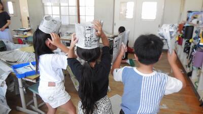 2年生の図工では、「新聞紙となかよし」で創意工夫をしながら