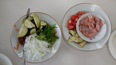 2年生は、収穫した野菜(ピーマン・トマト・ナス)をつかって