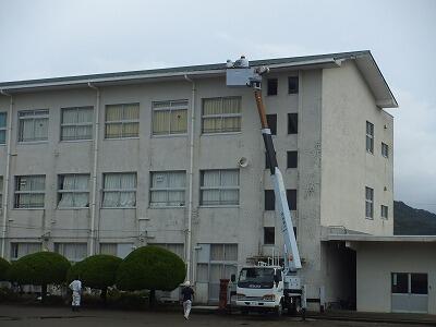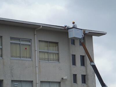 本日、日南建築業協会の皆様にボランティア活動をしていただきました。高所作業車を使って3号棟の雨樋の清掃や修理、校舎周辺の清掃等をしていただきました。3号棟の雨樋には土や木の葉が大量にたまっており、大雨の時には滝のように流れ落ちて、とても困っていました。