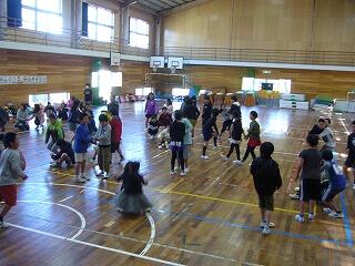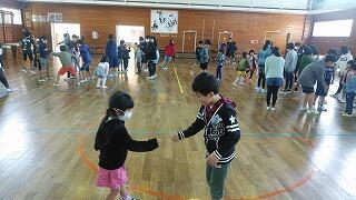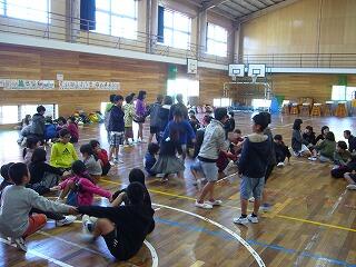 子どもたちは、体育館を回りながら音楽に合わせて次々と動きを変えていきます。