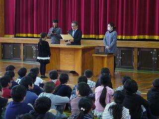 今日は、日南市立図書館長さんが本校においでになり、「旅する読書」100冊を達成した3年生女子を表彰してくださいました。