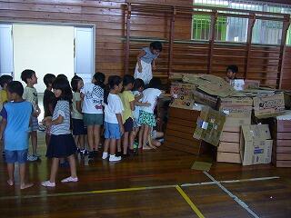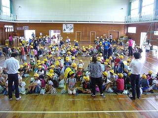まず、放送の指示に従い、ランドセル、靴、傘を持って体育館に集まりました。