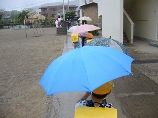 学校から借りた傘をさして、きちんと一列に並んで帰りました。