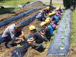 まず、割り箸にイモの苗を挟み、割り箸ごと土に差し込みます。
