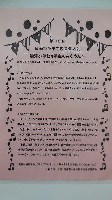 日南市小中学校音楽大会に参加した4年生に、音楽教育研究会の先生方から、お手紙が届きました。