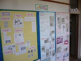 学校では、宮日新聞で取り上げられた記事(行事、作文、習字等)を掲示するコーナーを、事務室・校長室前に設けています。