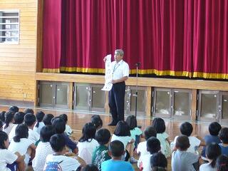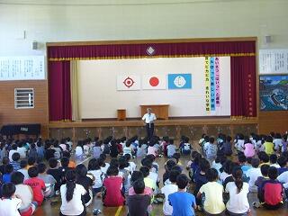 主な内容は、3年生の作文発表、校長先生のお話、表彰、先生方のお話(学習面、生活面、健康面)、水泳大会に参加する子どもたちの紹介です。