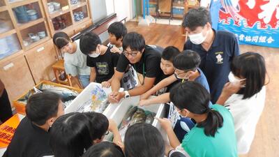 5年生の食育授業。学校給食会、南那珂農林振興局、県漁連、県漁協の方々から漁業についての展示やクイズ、一本釣り体験で学びを深めました。