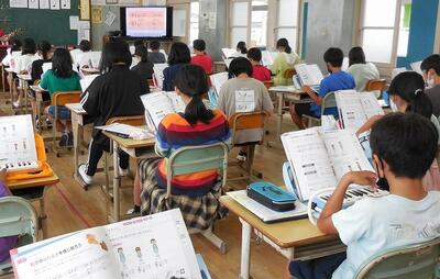 5年生の音楽の時間は、「和音のはたらきを感じ取ろう」を学習しています。和音のハーモニーと先生のギターの演奏で、楽しく学習できました。