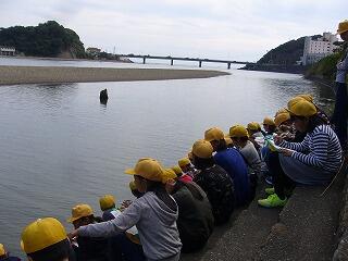 今日、5年生は市のバス(わかすぎ号)で、理科の学習として川原に行きました。