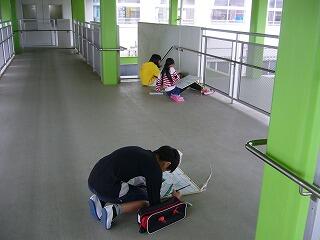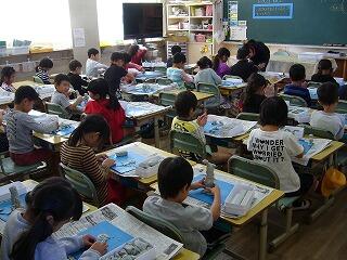 1年生の教室の前を通ると、新聞紙のかたまりを持っています。