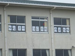 昨日の結団式で発表された運動会スローガンが、さっそく校舎の窓に貼られていました。今年のスローガンは、
