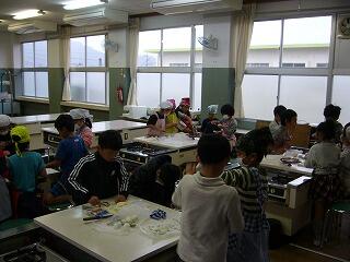 マスクをして三角巾を着けた2年生の姿が見え隠れします。